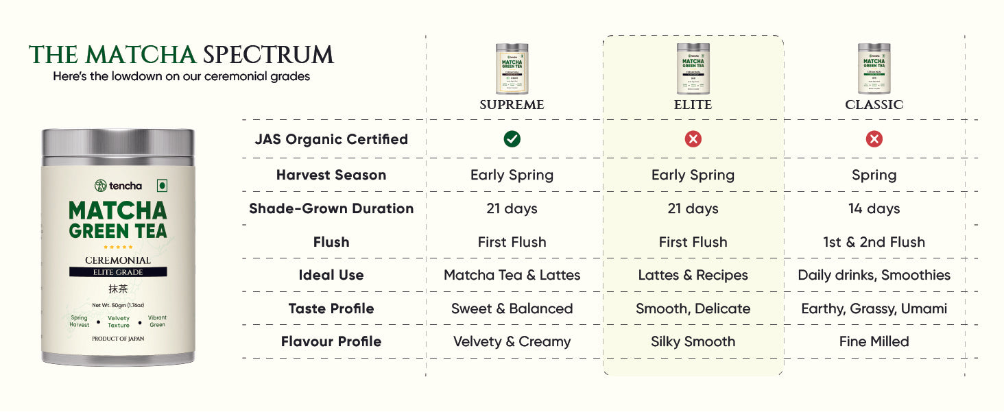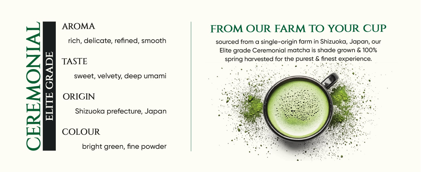 Ceremonial Elite Grade Matcha is derived from the fine, young leaves of the first harvest. Hand-picked and meticulously processed, it ensures that only the highest quality leaves are used, delivering an unmatched taste and superior health benefits.