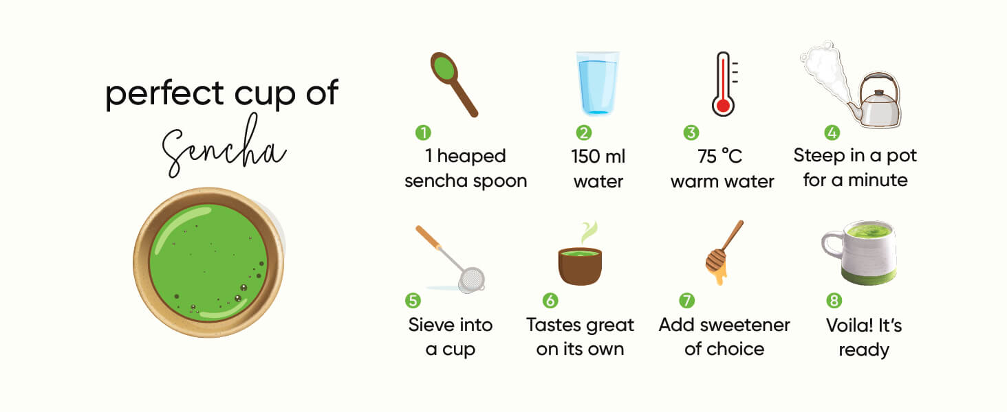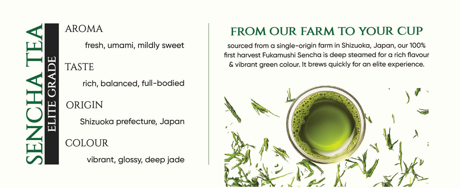 Sencha is a Japanese green tea made from steamed leaves and brewed in hot water. It has 3x more antioxidants than vitamin C and 30–50 mg of caffeine, about half that of coffee