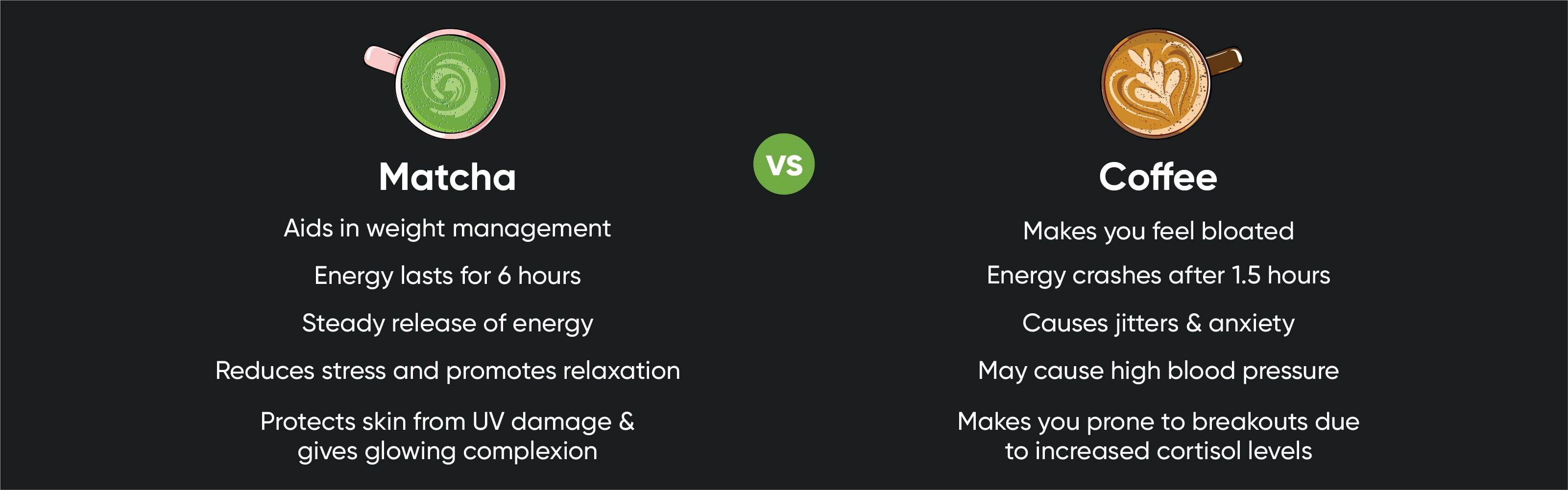 Matcha is the powder of green tea leaves, especially grown in Japan. When you consume matcha, you consume the whole tea leaf. Matcha has 137x antioxidants and 5x natural caffeine over green tea.